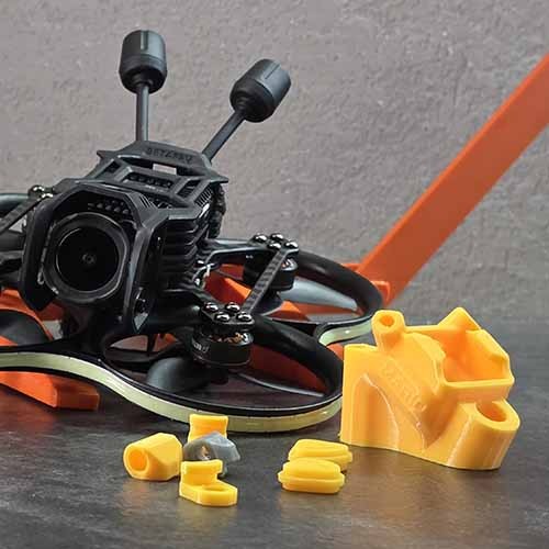 Na potrzeby drona FPV zaprojektowaliśmy i wykonaliśmy zestaw dedykowanych elementów montażowych. Części zostały przygotowane pod konkretne komponenty drona i wydrukowane w technologii druku 3D, zapewniając precyzyjne dopasowanie oraz niską masę.