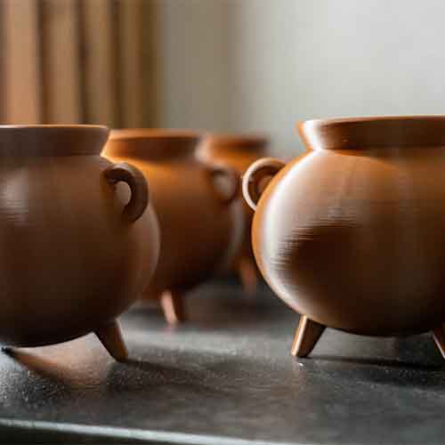Klient zgłosił się z własnym pomysłem oraz logotypem, prosząc o zaprojektowanie i wykonanie kociołków w kolorze brązowym. Elementy miały pełnić funkcję dekoracyjną oraz użytkową — jako pojemniki na długopisy. Projekt obejmował modelowanie 3D, dobór koloru oraz druk w technologii FDM z materiału PLA.
